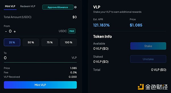 VLP 是 Vela 上的流动性凭证代币,可使用 USDC 铸造生成。VLP 铸造者将会基于 Vela 的交易量获得奖励,目前的质押 APY 大于 120% ,其中包括 60% 的平台费用收益和 10% 的资金费率收益。