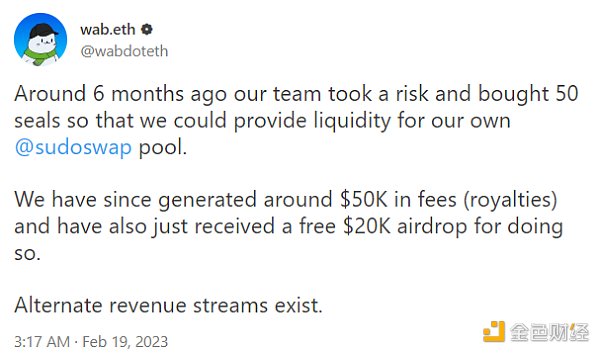 例如,Sappy Seals 团队获得了 50 个自己的 NFT,然后在 2022 年 8 月开始在 sudoswap 上用这些 NFT 做 LP。从那时起,该团队通过交易费赚取了价值数千美元的收入。其他使用这种 LPing 策略并取得类似成功的项目包括 Based Ghouls, Finiliar 和 Allstarz。