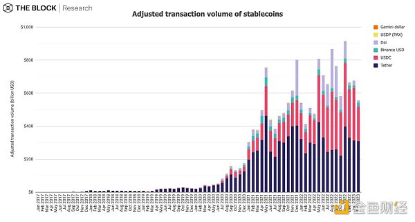 2、调整后的稳定币链上交易额减少至5581亿美元,跌幅达到了17.6%;已发行稳定币供应量则进一步收缩至1284亿美元,降幅约为3.2%,其中美元稳定币USDT和USDC的市场份额分别上升至 55.7%和31%。另一方面,纽约州金融服务部命令Paxos Trust Co.停止发行更多的BUSD代币之后,已有价值约56亿美元的BUSD被销毁。