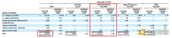 硅谷银行的最新年报显示,其投资组合中超过一半都是 1 年期到 5 年期的无风险国债。现在看来,该行对这类固定收益资产的高配置比例几乎已经超过了安全警戒线。