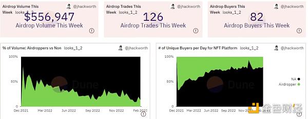 对于剩下的一小撮空投钱包,有些还是比较忠诚的。在 LooksRare 上, 20-30% 的每周交易量和约 25% 的每周活跃买家是空投者。