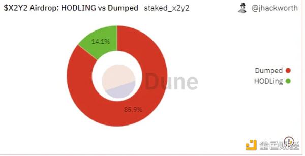 与 UNI 代币空投一样,最初,大多数的空投持有者选择了「抛售」代币。所以,这些钱包目前没有质押或持有任何代币。LooksRare 和 X2Y2 也不例外。超过 59% 的 LOOKS 和 85% 的 X2Y2 空投钱包最终选择了抛售代币。