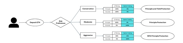 例如LSD收益聚合器协议Shield采用的策略之一是,质押者一半ETH存入LDO,获得主网①节点验证奖励的同时得到流动性质押代币stETH,然后将剩下的一半ETH共同组成stETH/ETH的LP存入curve获得②平台流动性奖励和③curve激励奖励,此举可以将纯质押的收益率提高20-30%;另外如果用户想要获得更高的收益,shield会将部分收益④购入锚定ETH价格的期权获得价格增值的收益,是一款加密世界的“固收+”产品。