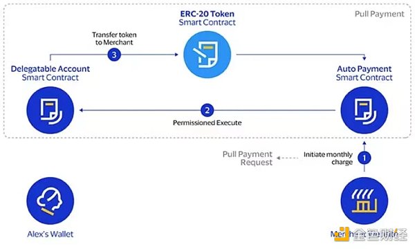 因此,如果你每两周用加密货币支付一次,你必须在资金存入钱包后手动启动“推送”(Push)交易来支付每笔账单。智能账户使得由记账人发起的“固定自动”付款成为可能。例如,一家电力公司可以在其网站上建立一个自动支付智能合约,并列出其功能。例如,它每个月只能发起一笔交易,并设定其将收取的最高金额。然后,用户可以通过他们的智能账户批准这些有条件限制的“固定自动”支付,从而在他们的双周工资到来后实现自动账单支付。