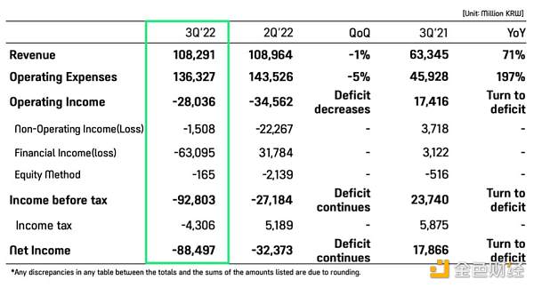 而在 Wemade 官网最新发布的三季度财报中,公司并未抑制住亏损的势头,并由于财务性收入上的损失,使得公司净收入亏损达到 884.97 亿韩元。