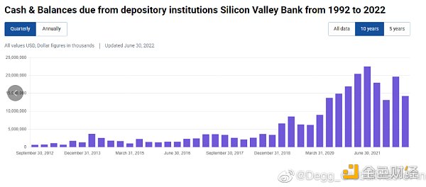 2020年下半年疫情担忧褪去后而美联储仍在承诺维持0利率很长时间,量化宽松持续进行,通胀也见不到影子,全球迎来了科技企业的融资热潮期,startups贷款和风投额度的快速增长使科技初创企业手里积累的大量的现金和存款,而这些存款很大程度流入了Silicon Valley Bank(下简称SVB)这一硅谷最重要的、也是全美前20大的银行。2020年6月至2021年12月的一年半期间,SVB的存款由760亿美元上升到超过1900亿美元,增幅接近2倍(图1)。