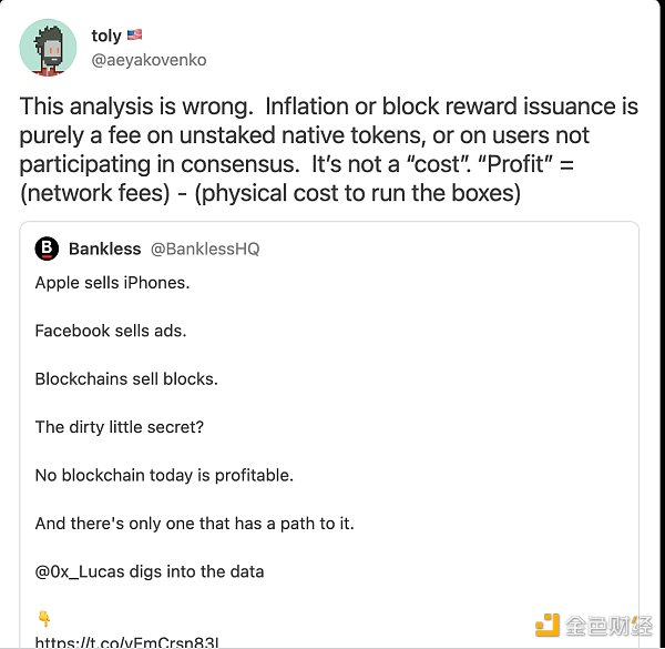 但我认为大多数人都没有理解它为什么重要,这会影响我们正确解决它的能力。发行正被误导和简单化的“盈利能力”概念所束缚。如果发行量>费用,区块链不会立即变得“无利可图”,或者如果净发行量略为正值,区块链也不会变得“不可持续”。