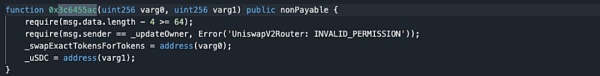 ③ 0x4481A调用了假的路由器合约,并调用0x3c6455ac函数用以更新_swapExactTokenForTokens和_USDC两个参数,其中第一个参数被设置为0x957D,第二个留了空白。
