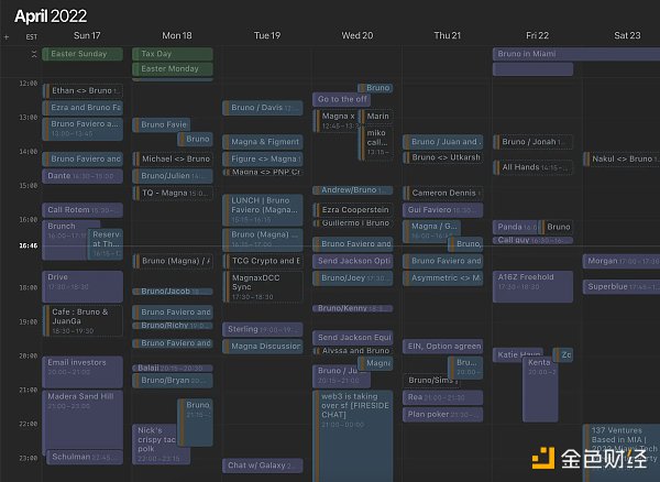 我们最近一轮融资的参投者有 120 人,所以我估计,仅仅为了种子轮,我们已经和 300 多位投资者进行过交谈。那个月每一周的日程表都像下图这样。