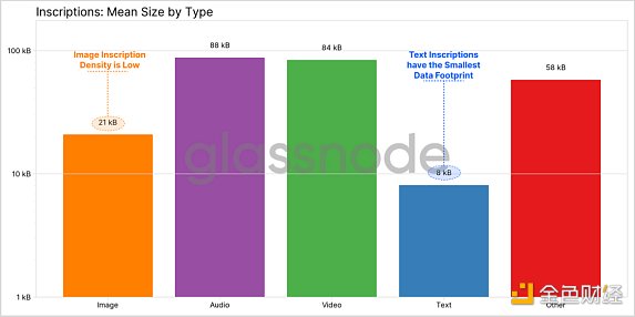 在评估铭文交易的平均大小时,图像类型数据密度仍然很低,每个交易将增加21kB的链大小。同样,文本铭文也有相当微弱的数据足迹,平均交易大小为8kB。