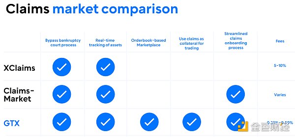 根据GTX官方文档信息,其认为自己与上文提到的两家债权交易平台相比,除绕过法院破产程序、实时跟踪债权人资产、简化债权交易流程三个共同点外,其还具有基于订单簿开发的市场,同时也可以使用债权作为交易抵押品。
