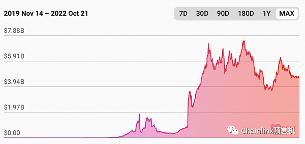 TVS指预言机等关键基础设施所保障的市场中存入的以美元计价的资产总值。Chainlink预言机向链上智能合约提供喂价、天气数据、体育比赛统计数据和储备金证明等数据。比如,截至2022年10月17日,Chainlink Price Feeds为Compound保障了价值超过10亿美元的stablecoin,而这些金额都被算进Chainlink的TVS中。