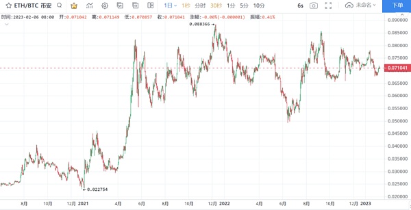 实际上,从2021年下半年开始,ETH/BTC交易对就进入了横向运行阶段。在这个区间内,ETH市值约占BTC市值的一半,这似乎成为了当前市场认可的某种价值平衡。