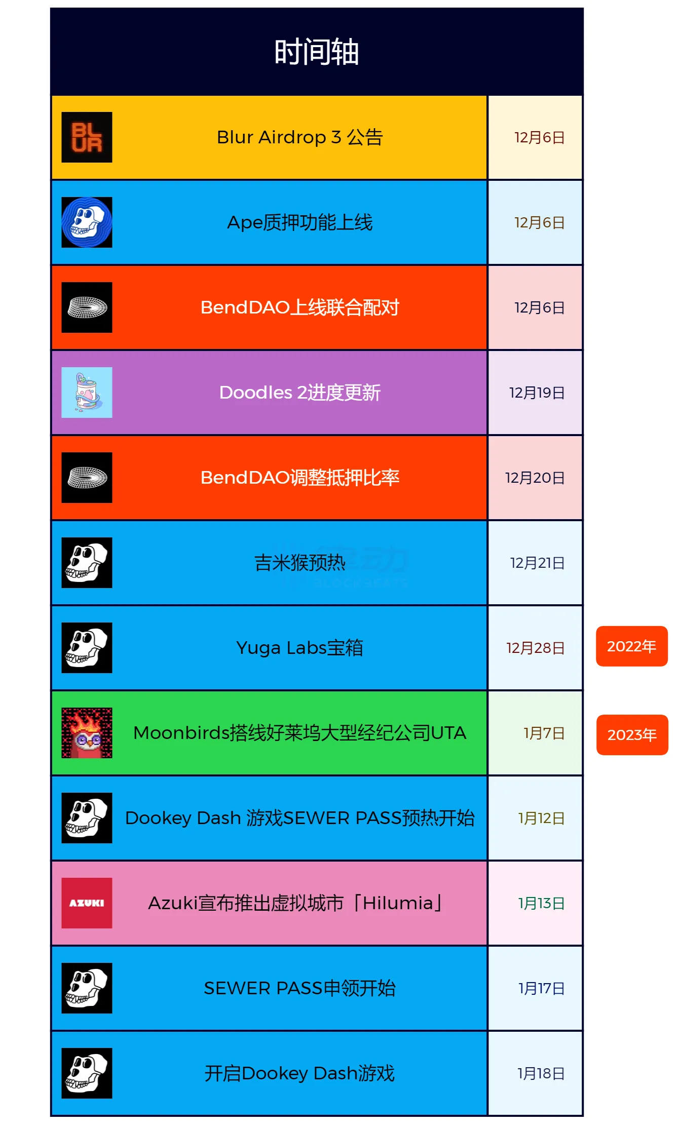 经过一年跌宕起伏的发展,Azuki 始终维持在顶级蓝筹的梯队,按照上文 Blur、BendDAO、Yuga Labs 的时间线推进,在 2023 年的 1 月 12 日将会迎来 Azuki 的周年庆。