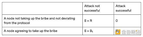 由于我们正在考虑任何拜占庭行为都可以客观归因的验证任务,因此即使节点行为诚实但攻击成功,该节点也不会在以太坊上被罚没(矩阵中右上角的单元格)。另一方面,一个同意接受贿赂并表现出敌对行为的节点,将在以太坊上被客观地罚没(矩阵中的底部一行)。如果需要 ? 的总权益被贿赂才能使攻击成功,则贿赂成本至少为 ?/3 × S。