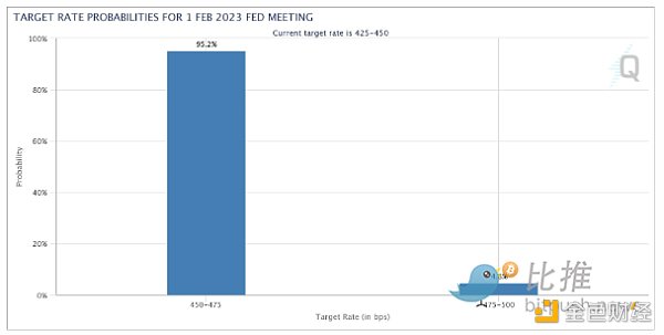 芝商所(CME)的 FedWatch 数据显示,美联储 2 月 1 日加息 25 个基点的可能性为 95%。 FedWatch 使用隐含的 30 天联邦基金期货定价数据分析利率和美国货币政策变化的可能性。