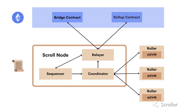 Roller 网络负责生成 zkEVM 有效性证明。Rollup 和 Bridge 合约,为 Scroll 提供数据可用性,验证 zkEVM 有效性证明,允许用户在以太坊和 Scroll 之间转移资产。