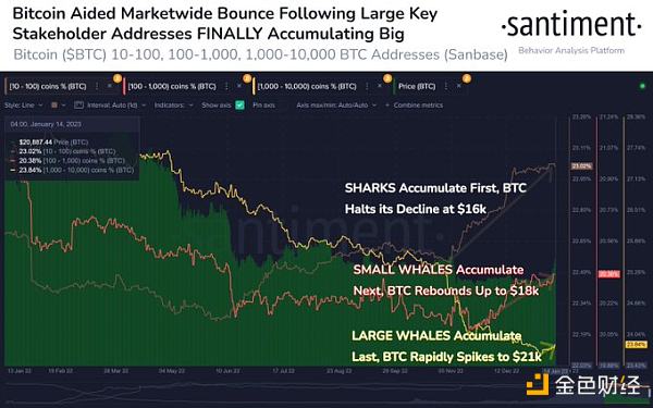 链上数据聚合商 Santiment 分享的图表对比特币为何跃升至 21,000 美元以上的近期高点做出了解释:多个比特币持有者群体最近表现出一些强劲的积累,其中大型“巨鲸”在过去 10 天内累积了 37,100 BTC。