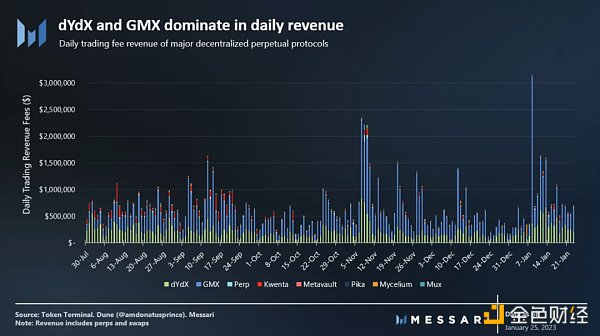 GMX 采用固定费用结构,交易者为发起交易支付 0.1%,为结束交易支付 0.1%。此外,由于掉期合约的结构,每小时会产生少量借款费用。由于费用较高,尽管交易量远低于 dYdX,但 GMX 通常可以获得更高的每日收入。 dYdX 和 GMX 共同为所有 DEX 创造了约 70% 的收入。