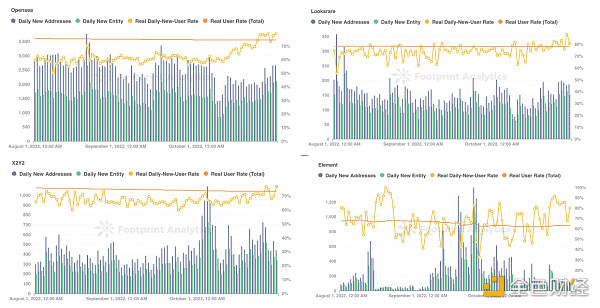除了Opensea以外下面其他3个nft交易平台都开开展过交易量活动,并都有着相对较高的每日真实用户比例波动,尤其是Element,他在9月、10月期间虽然有很高的新增用户,但真实比例最低只有30%,这意味着用户刷号行为十分严重。刷号行为则可能包括NFT左手倒右手,批量地址购买自己的NFT等行为。从另一个角度来看,Opensea的新增用户真实比例逐渐上升,平台良性发展,带来的结果就是真实的NFT买卖、更高质量的活跃用户和更高的留存率。
