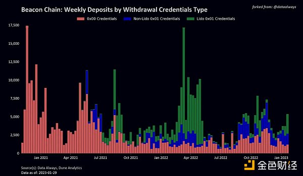 多数分析师假设两类验证者(0x00、0x01)具有一致的特征,但这是一个很大的错误。当我们查看下图中信标链存款时,我们看到所有创世验证者都是在没有设置 0x01 凭证的情况下创建的,这严重扭曲了数据。