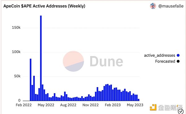 目前,APE 持有者地址已超过 12 万。但自 2021 年 2 月以来,持有 APE 的活跃地址数量一直在下降,目前已低于 1 万个。