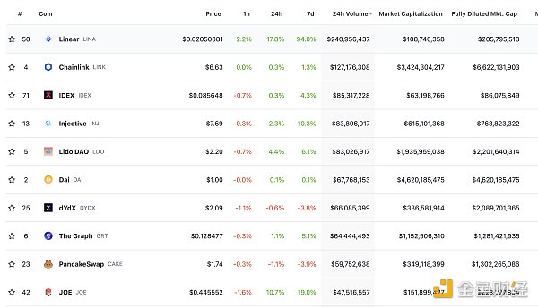24小时NFT交易量、交易量前十项目 数据来源:Coinmarketcap