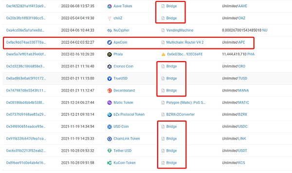 1、此地址的 APE 币种在 2022-04-02 授权给了 Multichain 的跨链 Router 合约,大家应该知道前几天 Multichain 出现了不可抗力因素的事件,但 Kucoin 并没有在第一时间取消对 Multichain 合约的授权。这体现出 Kucoin 在风险应急响应上还存在改进空间。
