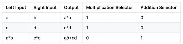 假设我们有两个门:一个乘法门和一个加法门。乘法门被表示为一个长度为3的向量|a|b|c|。如果这个门被选中,那么它将约束c等于a*b。同样,加法门表示为一个长度为3的向量,如果选择加法门,则c等于a+b。使用这些门,让我们表示两个向量(a,b)和(c,d)之间的点积。要做到这一点,我们需要完成以下计算:1. 使用乘法门计算a*b2. 用乘法门计算c*d3. 用加法门计算ab+cd这可以用向量来表示。