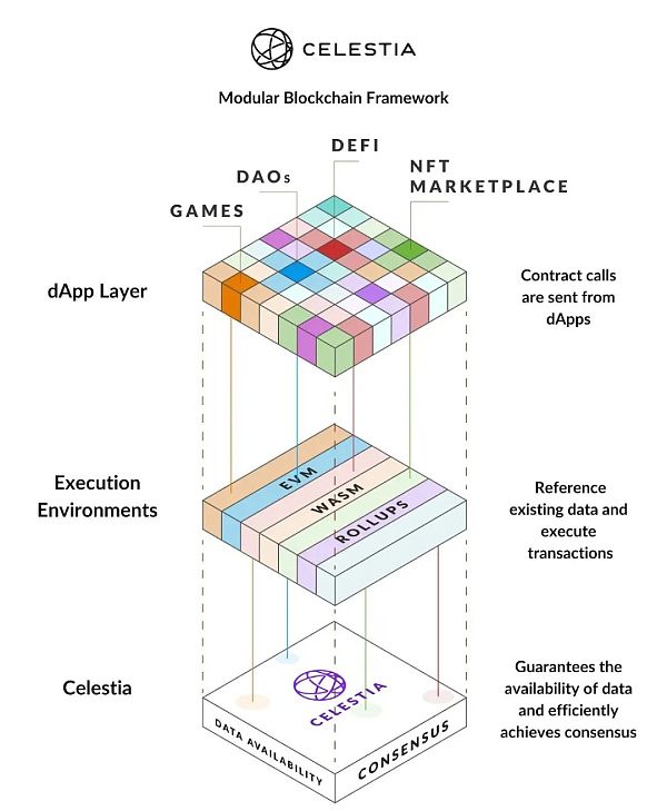 Celestia 是一个模块化协议,它只处理数据可用性(DA),其他执行和结算工作可以锁定DA 层,开发人员可以直接选择要使用的执行环境在Celestia上构建 DApp。