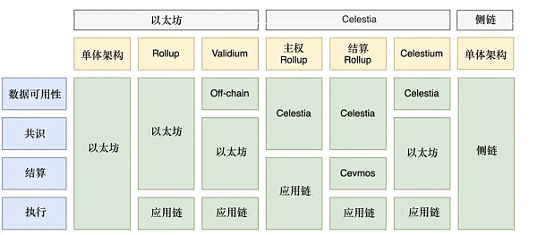 ③ Celestium: 数据可用性层为 Celestia,共识层和结算层为以太坊,应用链为执行层。