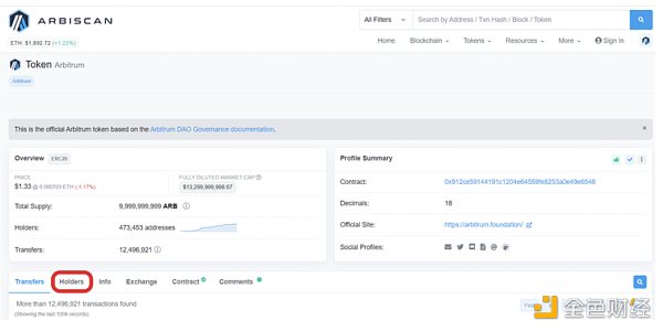 访问Arbitrum Explorer,导航到Arbitrum代币页面,再到持有人部分,其中持有人的列表按照他们的持有量排序。请注意,排名最高的钱包可能是官方钱包和交易所钱包。