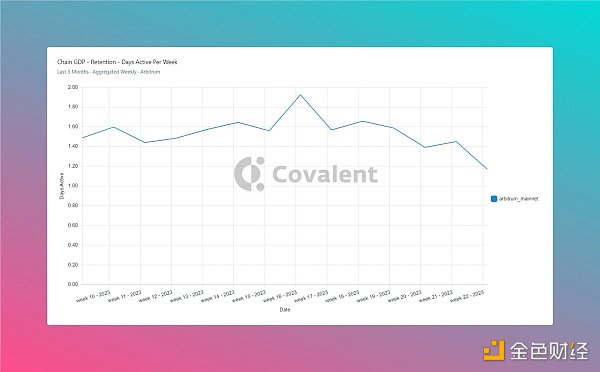 现在我们来看一下 Arbitrum 的保留情况。留存情况似乎在更加快的速度下降(可能是因为空投)。每周“用户”活跃的天数也较低。