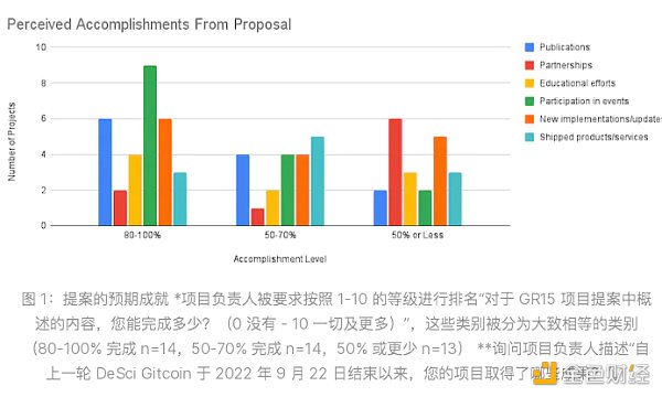 DeSci 项目在出版物、合作伙伴关系、教育工作、活动参与、新实施/更新以及交付的产品/服务方面取得了成就。在表示已实现所有目标的人中,有七分之五参加了活动。然而,合作伙伴关系往往是由未能实现其目标的项目实现的。