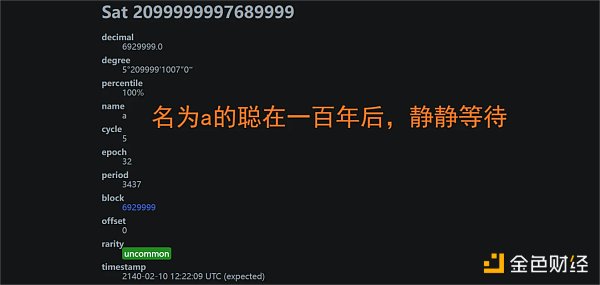 认真观察聪的表示方式不难发现一些有趣的事情。名为 0 与 a 的聪在时空两端遥相呼应,共同串联起了这一横跨 2100 万亿枚,历时一百三十多年的恢弘史诗……