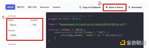 输入名称(Name)、符号(Symbol)、数量(Premint),并单击“Open in Remix”。