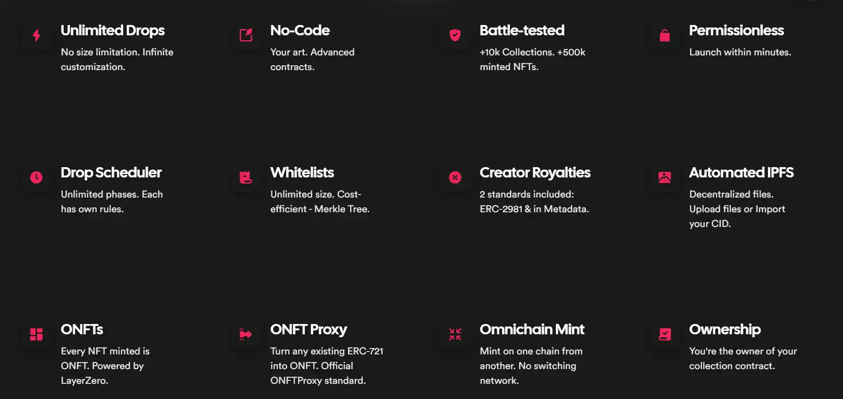 NFTs2Me 是一个免费的多链平台,用户可以创建、部署和管理他们的 NFT 集合和社区。它提供了一个用户友好的界面,用于创建 NFT 项目,将其数字资产和元数据上传到 IPFS。该平台还在区块链上提供优化的合约部署,具有超低的费用和先进的功能,例如不同的铸币类型(顺序、指定、随机)、使用任何 ERC-20 或原生 coin 铸币、无钱包和可升级的信用卡支付合同。它通过自定义子域、铸造小部件、许可名单、白名单、空投和只有持有者才能访问的代币门控内容来管理 NFT 集合及其社区和社区。目前已有部分 NFT 项目通过 NFTs2Me 铸造并获得关注。