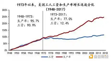 通货膨胀的意义似乎也脱离了激励市场的范畴,更多时候通货膨胀的意义似乎仅在于促进底层劳动者们名义工资的增长从而掩盖实际收入的停滞。恰好就在 1970 年代以后,美国工人的实际工资陷入停滞,贫富差距逐渐增大。