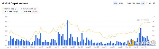 回顾过去三个月 NFT 市场的表现,可以发现市场呈现下降趋势。总市值从 510 万个 ETH 大幅下跌 23.64% ,至 390 万个 ETH。 蓝筹股指数,虽然在 5 月 31 日至 6 月 5 日期间出现了短暂的反弹,但总体上也呈现下跌趋势,从 8.5K ETH 下跌 12.22%, 至 7.5K ETH。