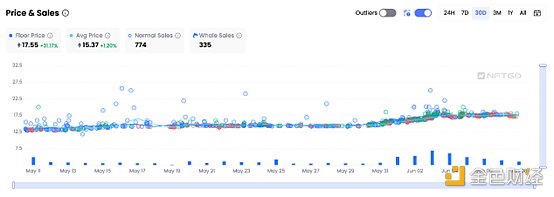 Azuki 最近的市场表现显示出稳定和持续的增长态势,上个月Azuki底价从 13.34 ETH 上涨 31.38%, 至 17.54 ETH。 平均价格创下年度新高,对 Azuki 来说是一个重要的里程碑。 5 月 17 日出现了小幅波动,但总体趋势仍然以积极为主,平均价格上涨 28.6%,从 13.6 ETH 上涨至 17.49 ETH。 市场上大量交易带来的销售交易数量也是 Azuki 市场动态的一个关键指标。