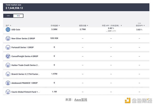 RWA:Aave是继Maker之后第二个引入RWA资产的DeFi协议,与Centrifuge Tinlake合作,RWA市场与Aave借贷市场是分开独立运行的。当前资金规模约为765万美元,相比Maker 23亿美元的规模远不能及。目前只有USDC市场还能提供存借APY,其它市场都已不再提供,成功通过KYC的用户只需在USDC市场存入USDC,可获得2.83%的基础年化收益以及4.09%的wCFG流动性挖矿收益率。