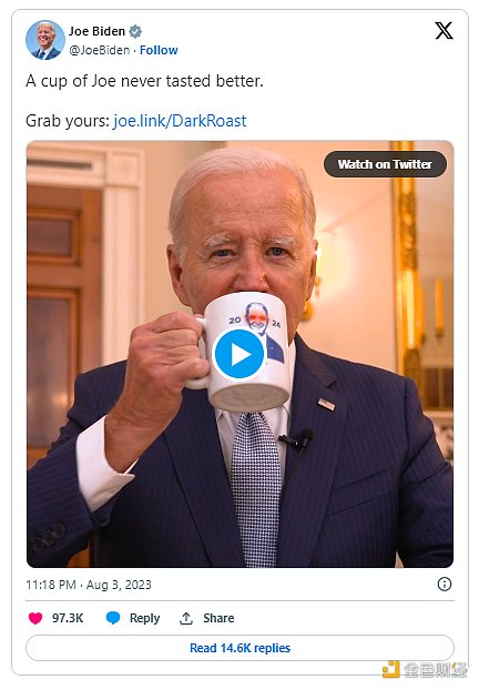 8 月 3 日,拜登总统在推特上写道:“一杯乔的咖啡味道从未如此美妙”,并附上了自己用杯子喝咖啡的视频。