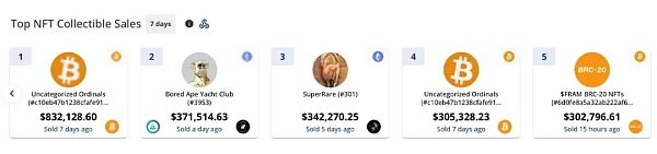 数据显示,随着追逐模因币的狂热逐渐转向现货交易基金的狂热,2023年下半年的第一周,NFT的销售额相比上周下降了23.39%,标志着连续两周的下降趋势。目前NFT总销售额为1.9595亿美元,其中以以太坊为基础的NFT销售额为1.3077亿美元。近7天,NFT总市值跌至60.66亿美元,跌幅1.24%,总交易额跌至1.31亿美元,跌幅46.05%。
