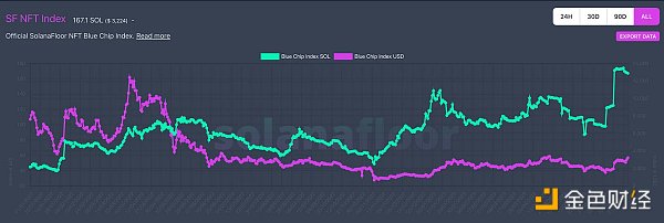 SolanaFloor NFT 指数由精心挑选的一篮子蓝筹组合组成,这些蓝筹组合基于多个加权标准:交易量、社会趋势、年龄和其他统计数据。SolanaFloor 图表以 SOL(绿色)和 USD+++++++++++++++++++++(紫色)表示该指数。