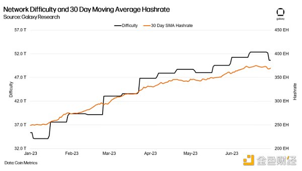 与2022年上半年相比,网络算力的增长速度更快。从2023年初开始,30天跟踪网络算力从249 EH增长到370 EH,增长了49%,而2022年上半年的增长率为22%。