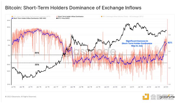短期持有者在交易平台流入中的主导地位已飙升至 82%,目前大大高于过去五年的长期范围(通常为 55% 至 65%)。由此,我们可以证明近期的大部分交易活动都是由 2023 年市场中活跃的巨鲸驱动的(因此被归类为 STH)。