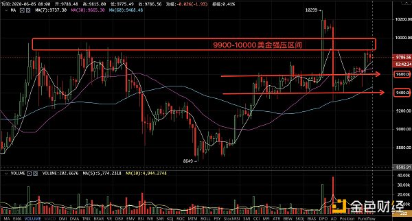 日线级别,大盘整体向上的趋势并没有破坏,MA30均线支撑、MACD金叉,Boll带上轨,指标都比较健康。短时看强压区间在9900-10000美金,支撑在9500-9600美金区间,大体的走势是偏震荡整理走势。量能未能有效放大前,方向不定,操作上以观望为主,小仓位试单。
