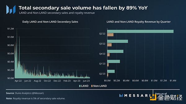 尽管土地销售总量超过了非土地一级销售,但非土地一级销售量增长了30%,高于任何单一的 Land 销售类型。在整个 23 年第二季度,用户可以从地狱厨房和帕丽斯希尔顿等各种著名系列中铸造不同的非 LAND 资产,这些系列也在整个季度举办活动。