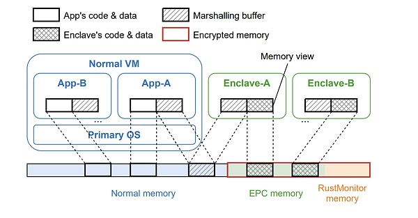 HyperEnclave中最关键的部分是称为RustMonitor的监视器,用于保护enclave免受来自其它enclave和来自操作系统的危险。enclave和操作系统在虚拟化的"guest"模式下执行,这意味着它们每次尝试访问内存时,所访问的内存地址首先通过由RustMonitor所管理的页表进行转换。通过将enclave放置在物理内存的不同区域中,RustMonitor可以确保它们永远无法读取或覆盖其他enclave所拥有的数据。但这不能仅仅是简单的静态分离:一些内存地址必须被允许重叠,以便enclave与操作系统进行通信,并且地址映射在处理页面中断时会被更新。