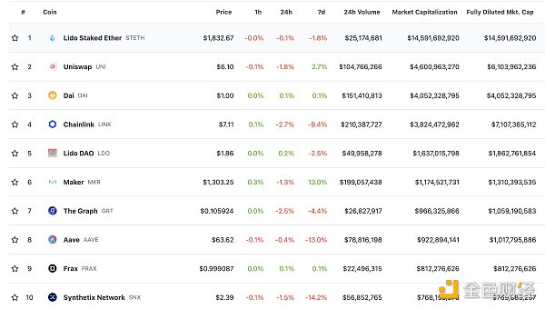 1900/1/1 0:00:00DeFi数据1、DeFi代币总市值:481.04亿美元 DeFi总市值及前十代币 数据来源:coingecko2、过去24小时去中心化交易所的交易量39.